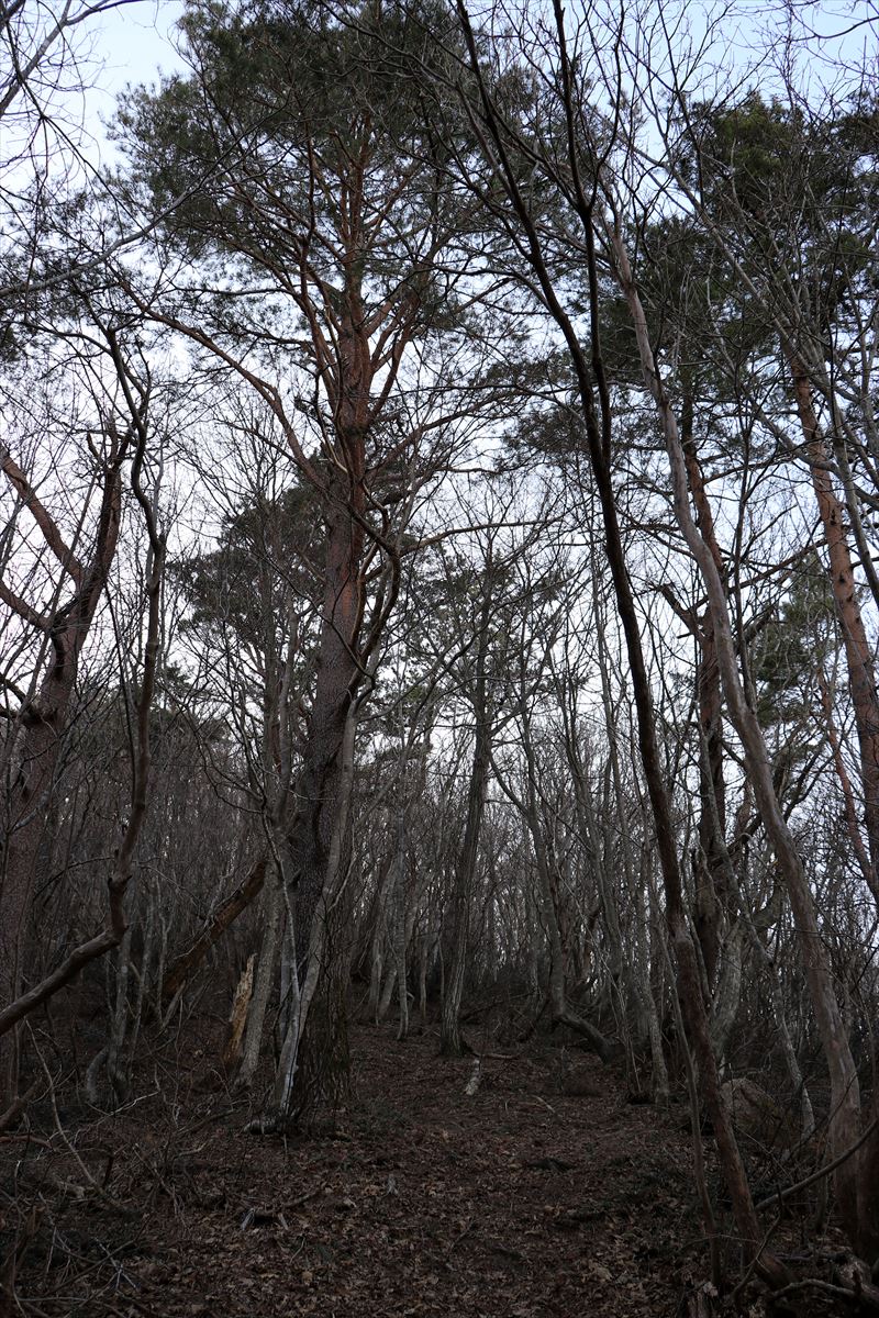 聖山山頂の雰囲気。木々が密に茂っているので展望はありません。少し西側に進んだ所に展望地があるようですが、既に暗くなり始めていた上に藪が濃くて道筋も怪しかったので立ち寄らず。