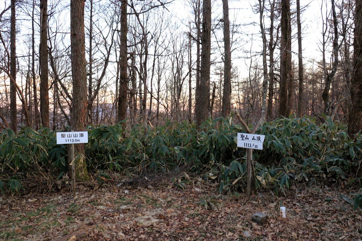 分岐から割とすぐという所で聖山の山頂に到着。まだ日没までは30分以上ありましたが、本日はここで行動終了としました。