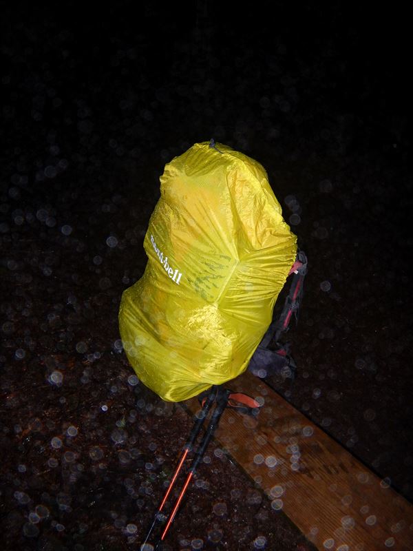 予定では前日同様に3時半出発のつもりでしたが、暫く天気の様子を見ていてこの時刻の出発に。雨脚は弱まってきたものの遂には止んではくれなかったので、雨具にザックカバーという装備でのスタートとなりました。
