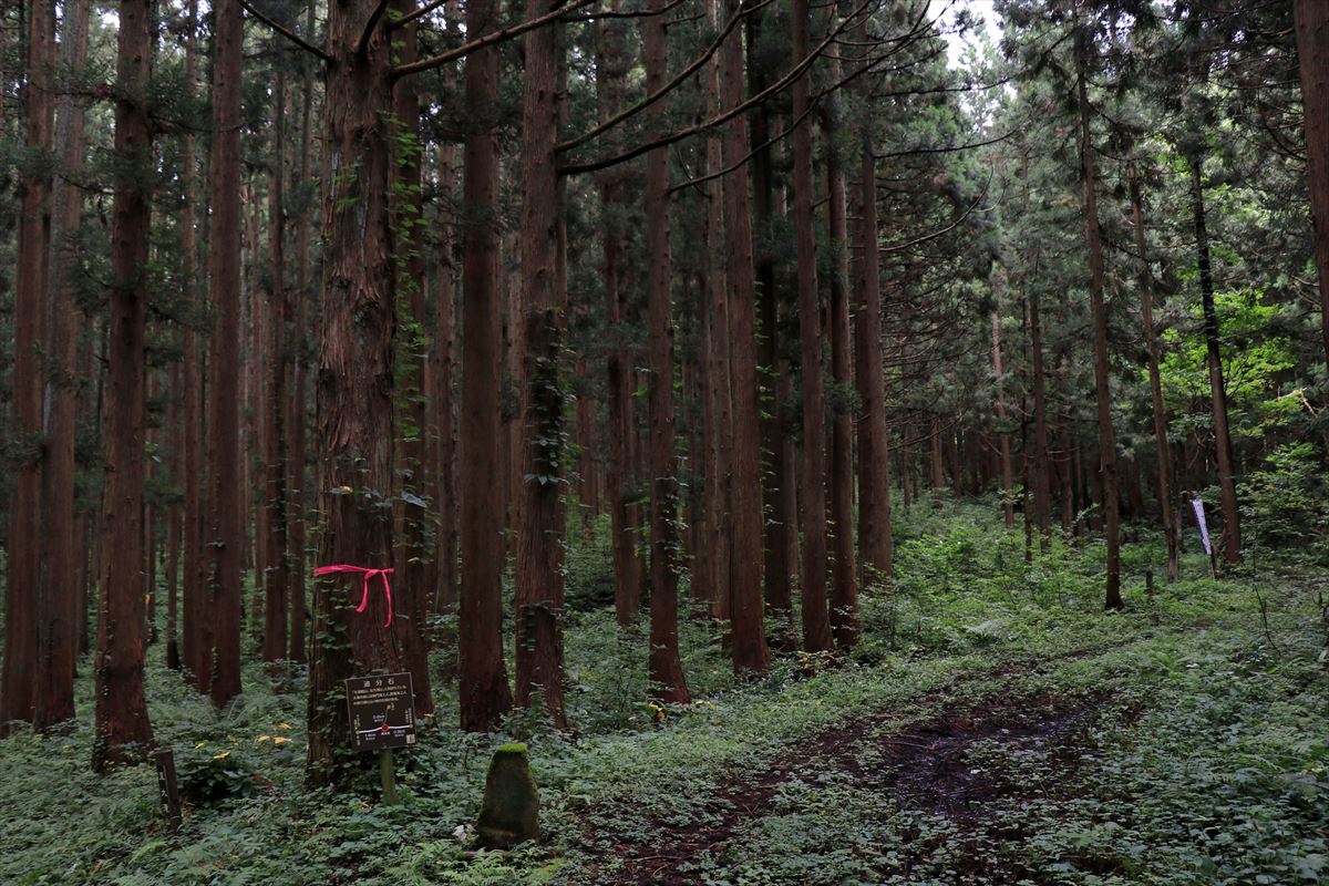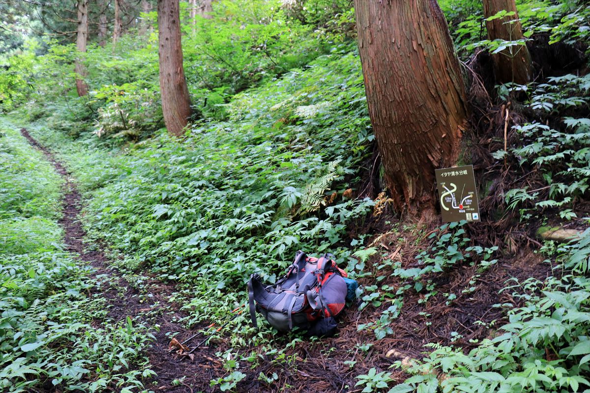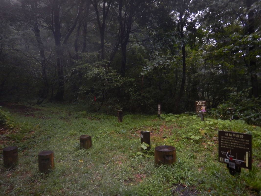辺りは広場となっており、他の六十里越街道のチェックポイントと同様に丸太の椅子が置かれていました。休憩するには良さそうな場所ですが、雨が止んだという事で藪蚊がここぞとばかりに湧いて出てきており、気付けば雨具とレイングローブの間の手首の所に5匹くらい止まっていた……こんな所で呑気に休憩したり雨具を脱いだりしていたらボコボコにされてしまう。小休止に留めて再出発しました。