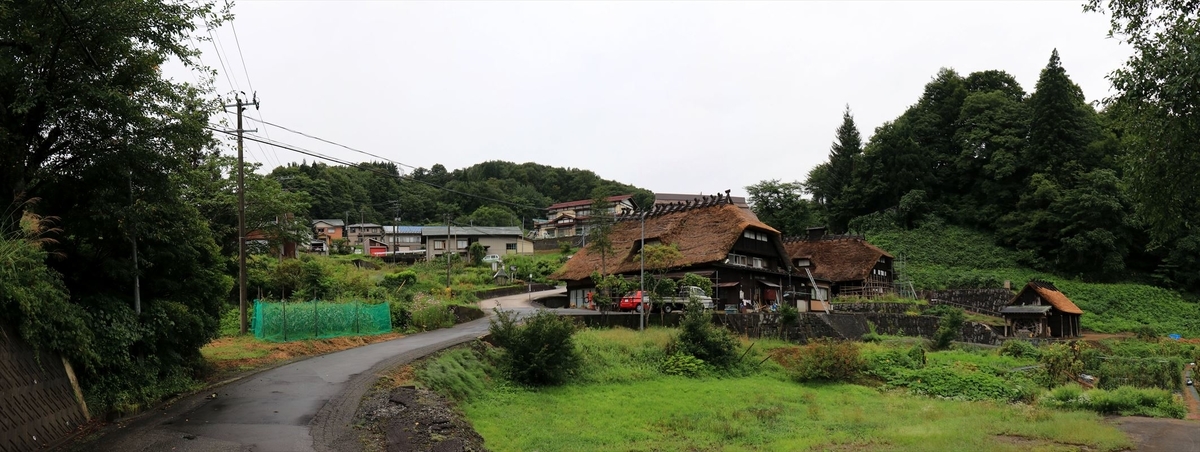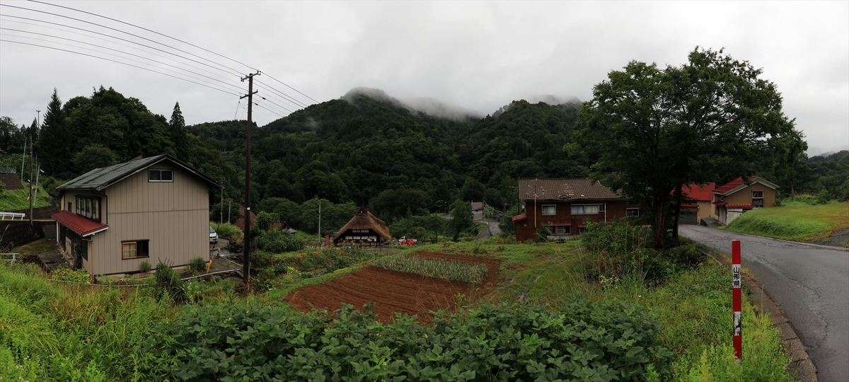 古民家と田麦俣の集落の全景。平坦な土地は少なく、家並みが斜面に段々となって続いている。定住している人も多いようで、静かでありつつもどことなく生活感のある集落でした。