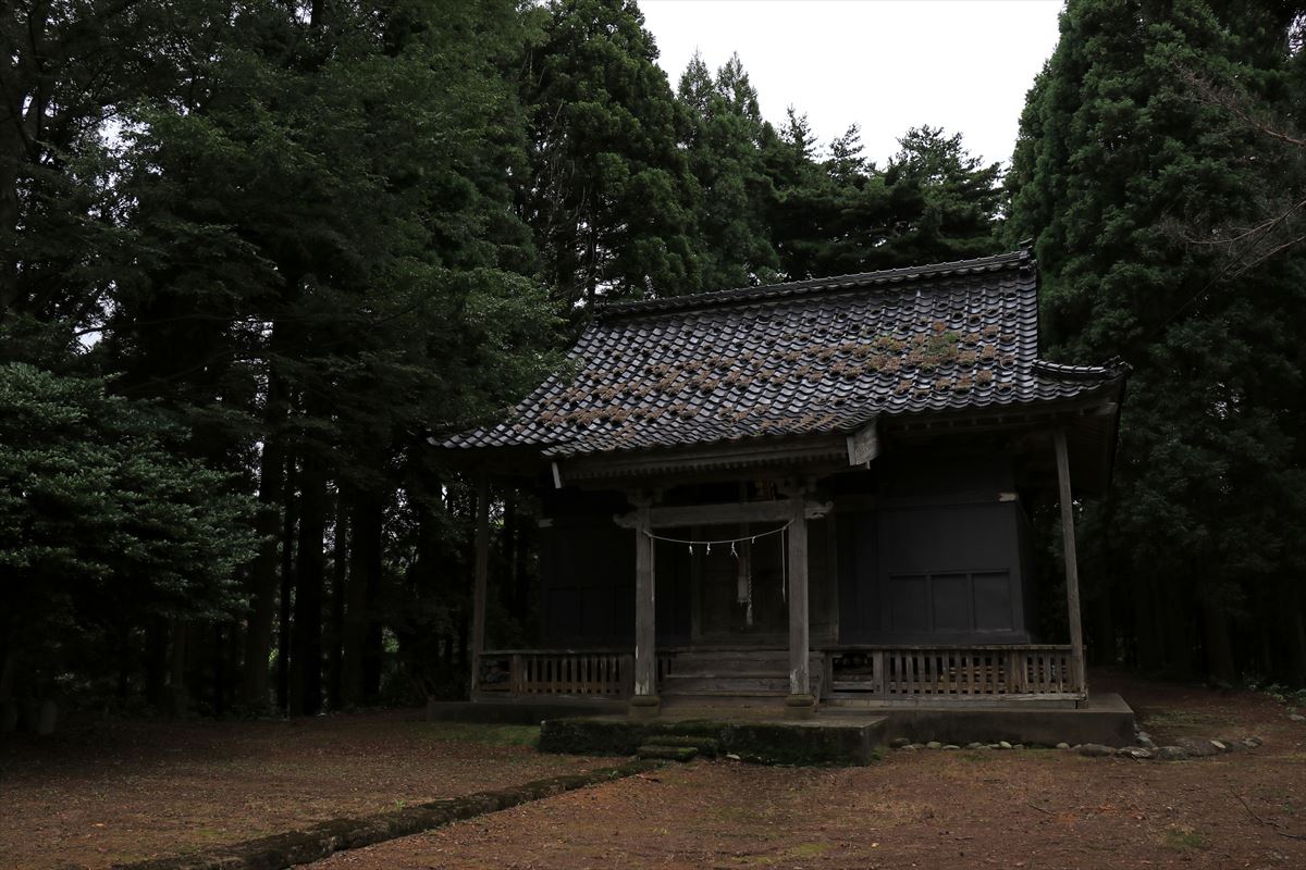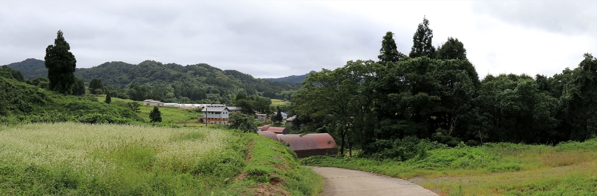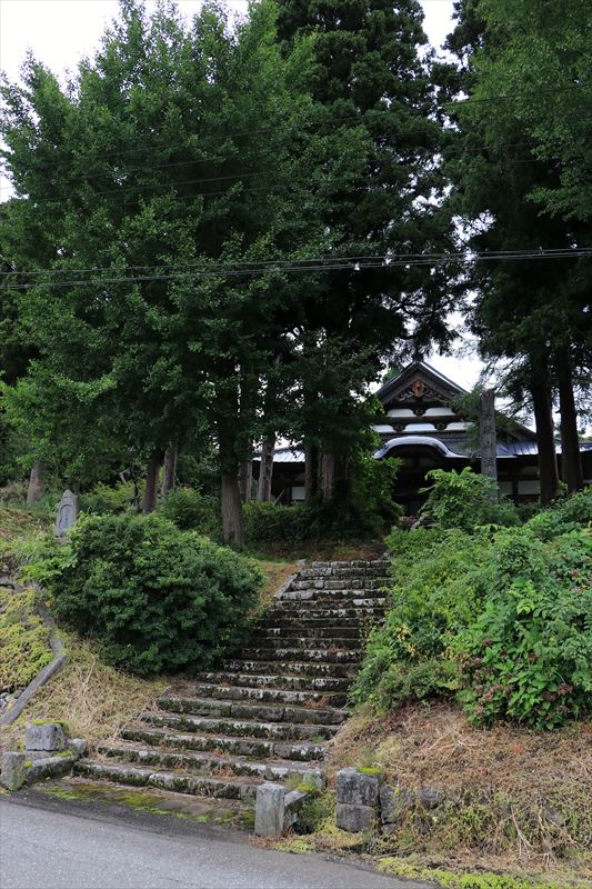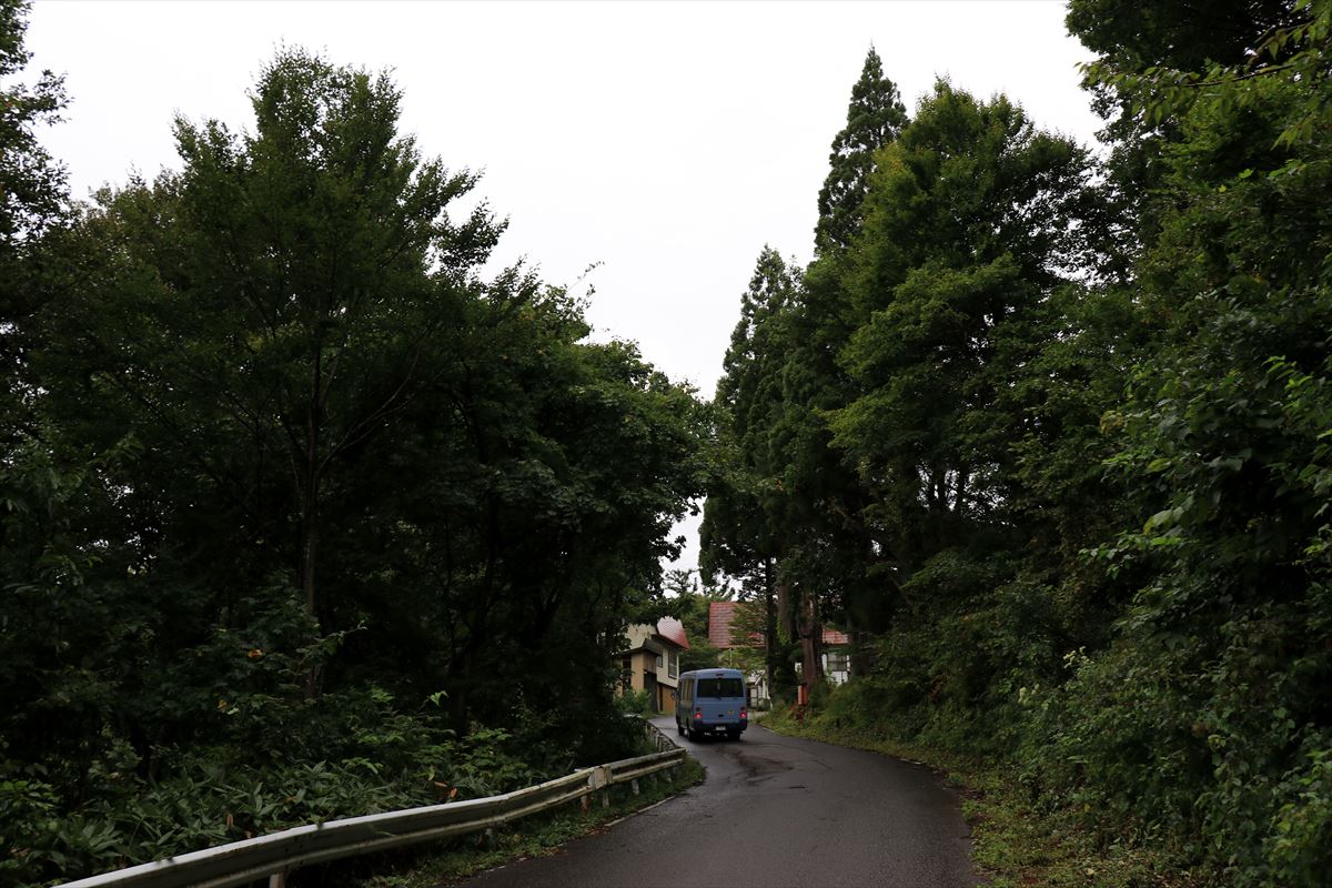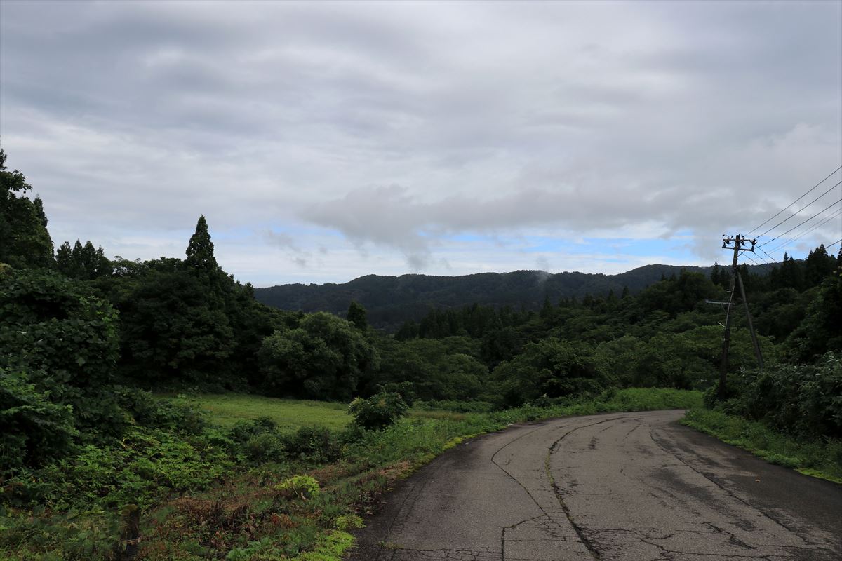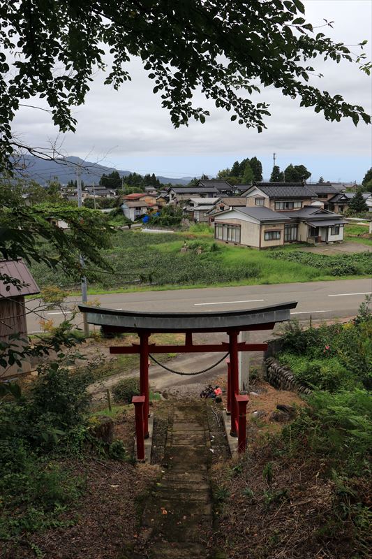 神社の参道から鳥居を見下ろした所。これにて六十里越街道は踏破(厳密に言えば笹小屋から山形盆地方面の区間もありますが)となりますが、バス停はこの集落を含めて付近には存在しないので、もう少し歩く必要がある。