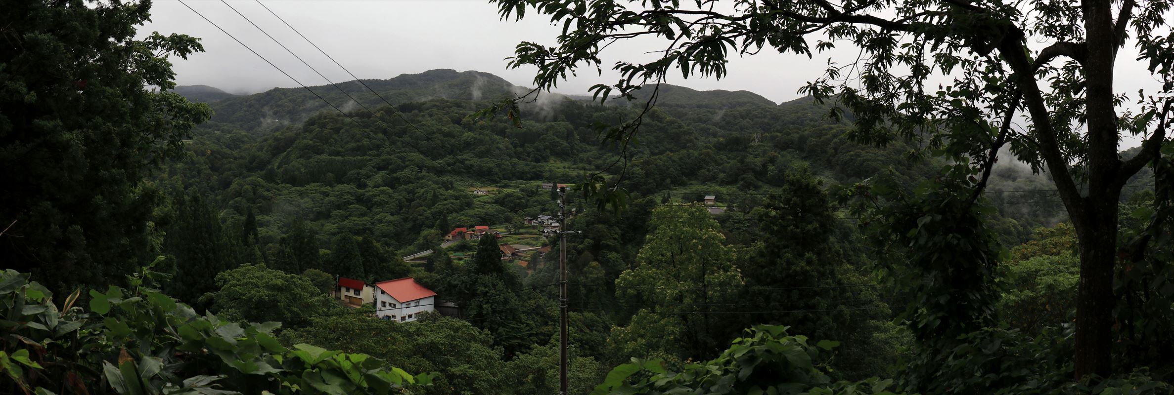 途中で田麦俣集落を振り返る。集落は谷底近くという事で周囲の木々に埋もれており、先程の茅葺き屋根の古民家は屋根部分が僅かに見える程度。