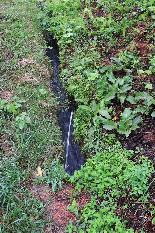 イタヤ清水の様子。五地蔵と呼ばれている石碑の横から塩ビのパイプが伸びており、そこから滔々と湧水が流れ出していました……この場所が本日で最後の水場となるので少しだけ補充しておく。