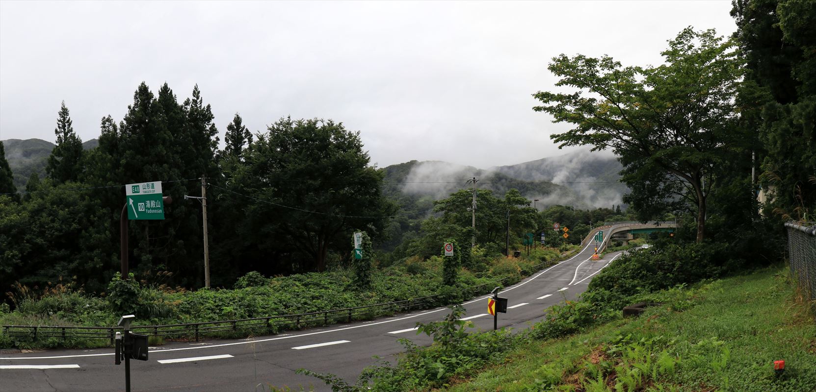 柳清水から先程横断した月山道路を振り返る。すぐ先にはランプがあり、そこで高速道路である山形自動車道に接続している。