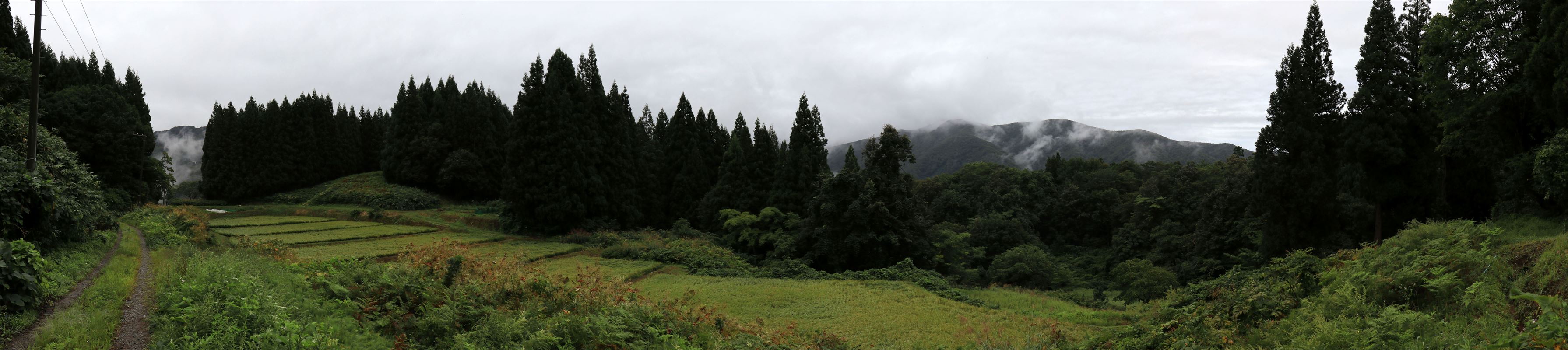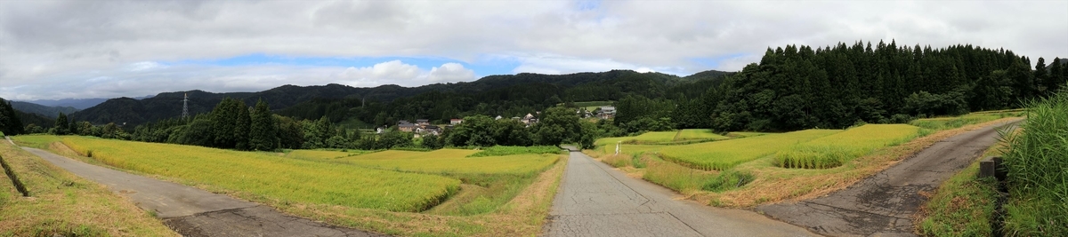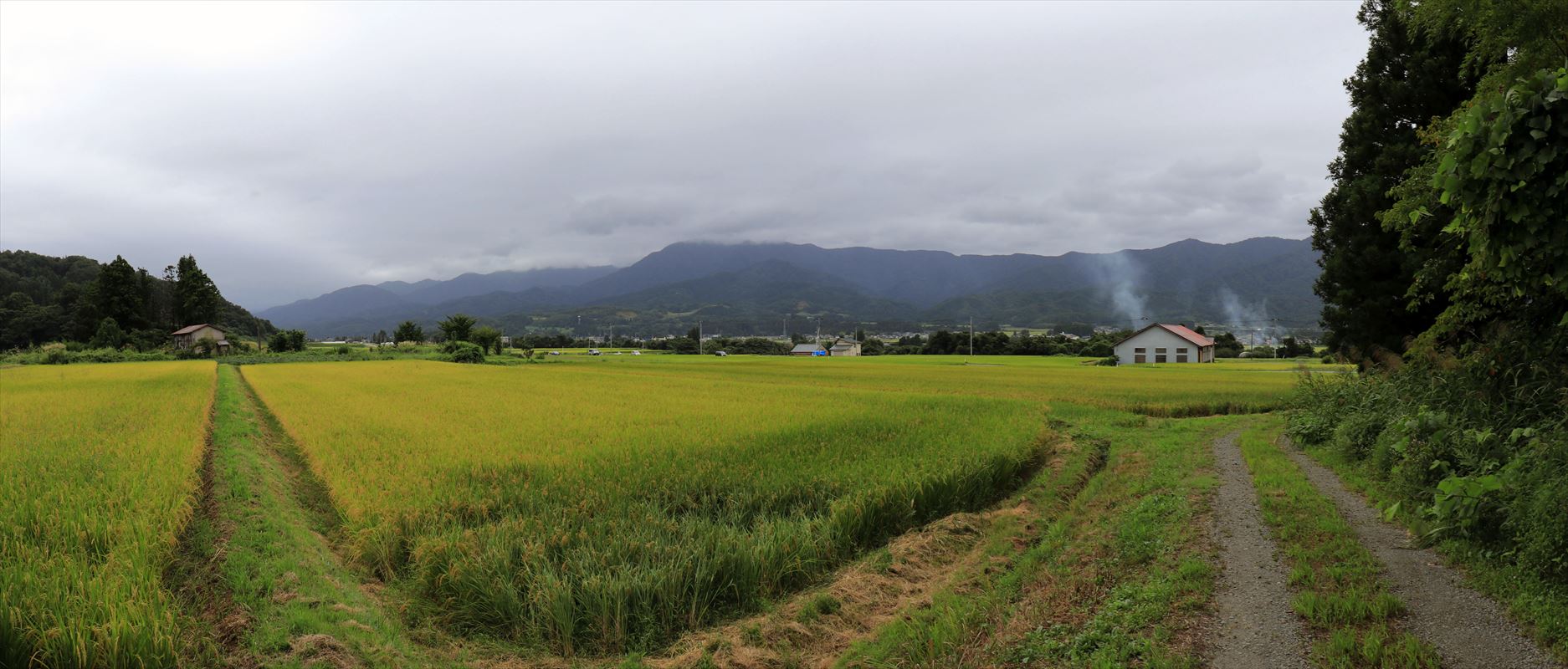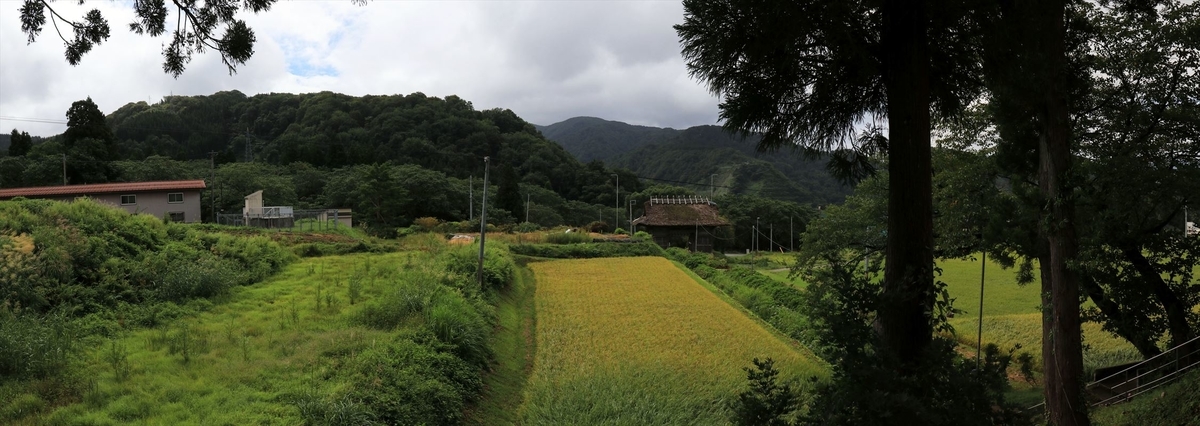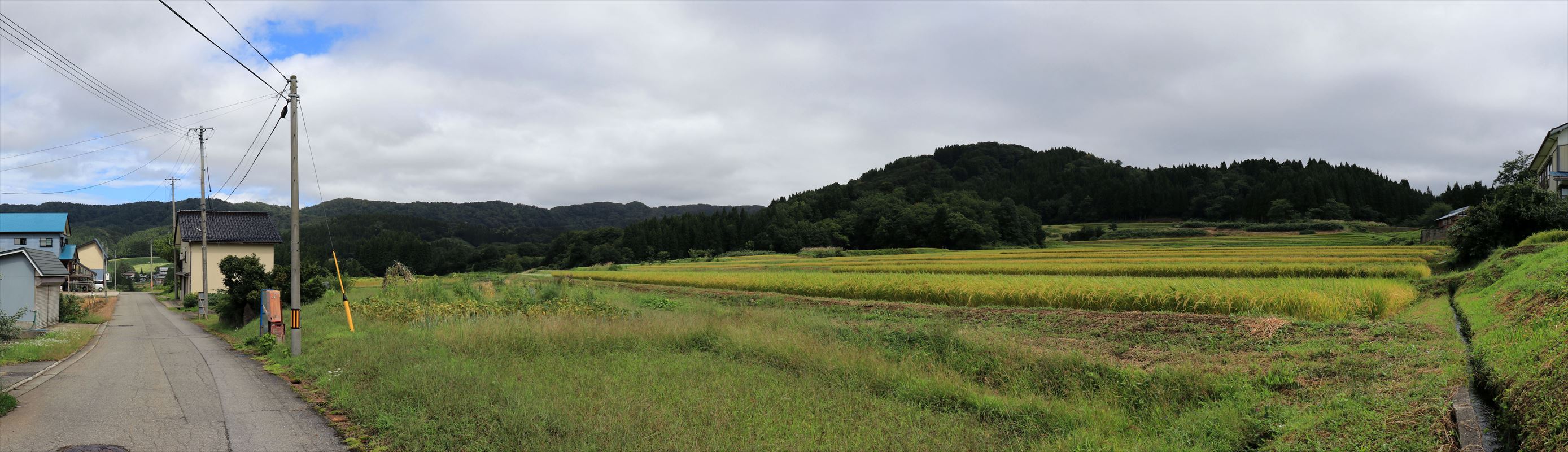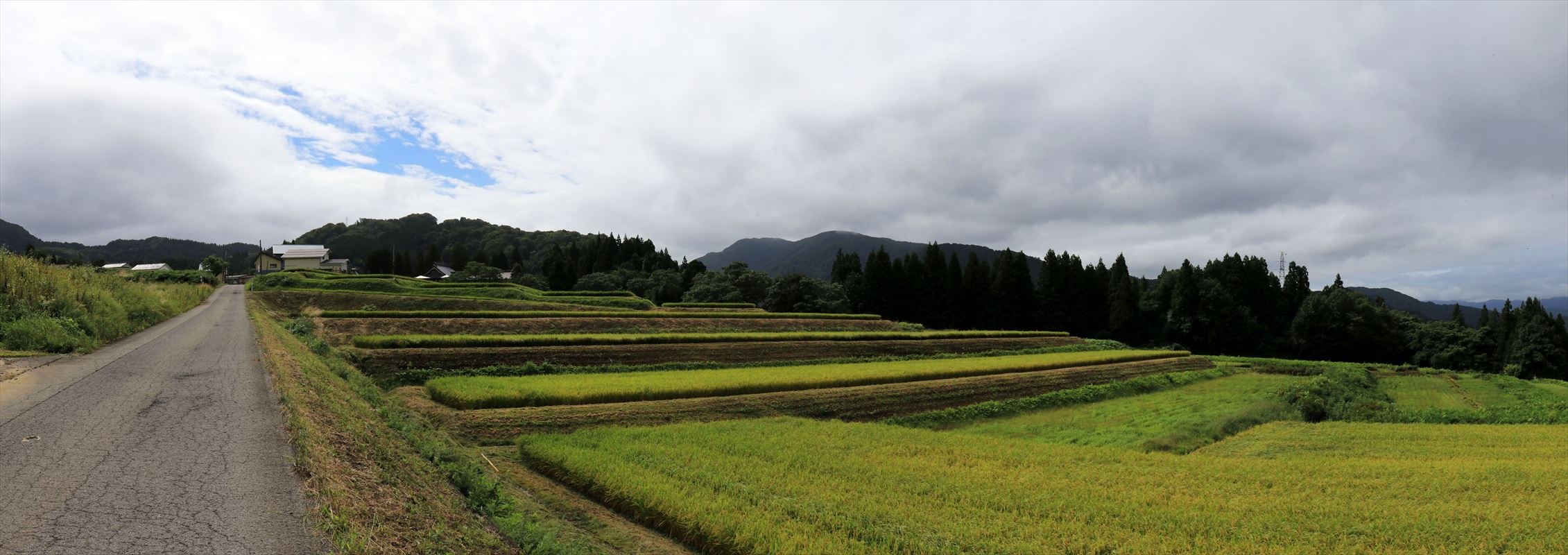 谷の方まで段々状に続く棚田の様子。既に稲穂が実っていますが、山間の冷涼地という事もあるのか、まだ少し収穫には早いかなという様子。