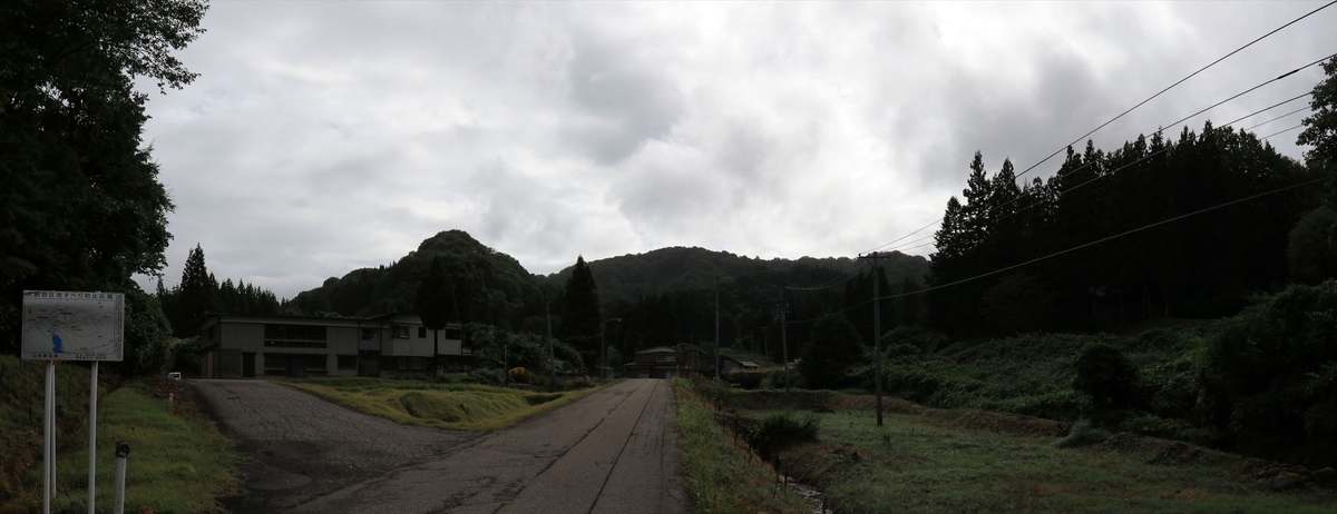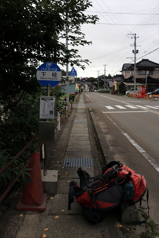 その上山添の集落の中にある下桂のバス停にてゴールとなります。六十里越街道そのものも長くてしんどい道程でしたが、最後の7kmの舗装路歩きが特に堪えた。