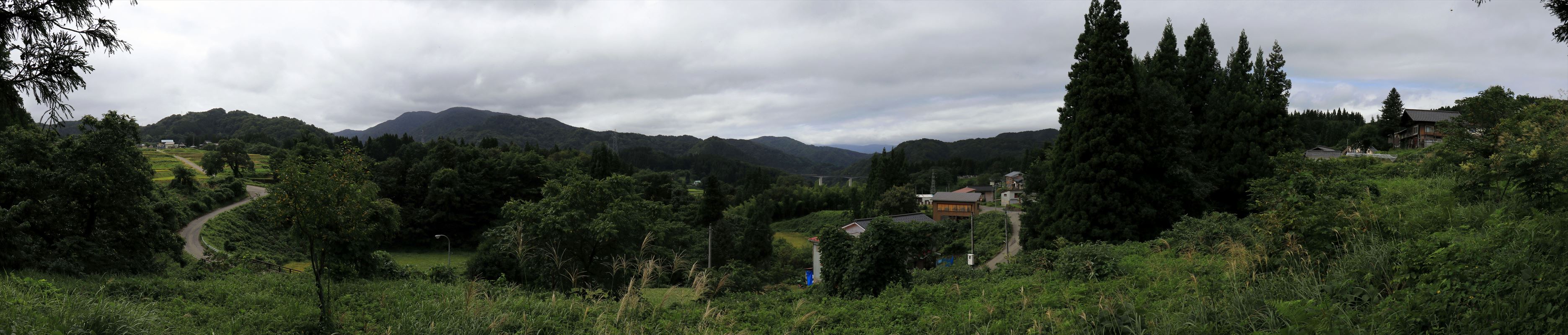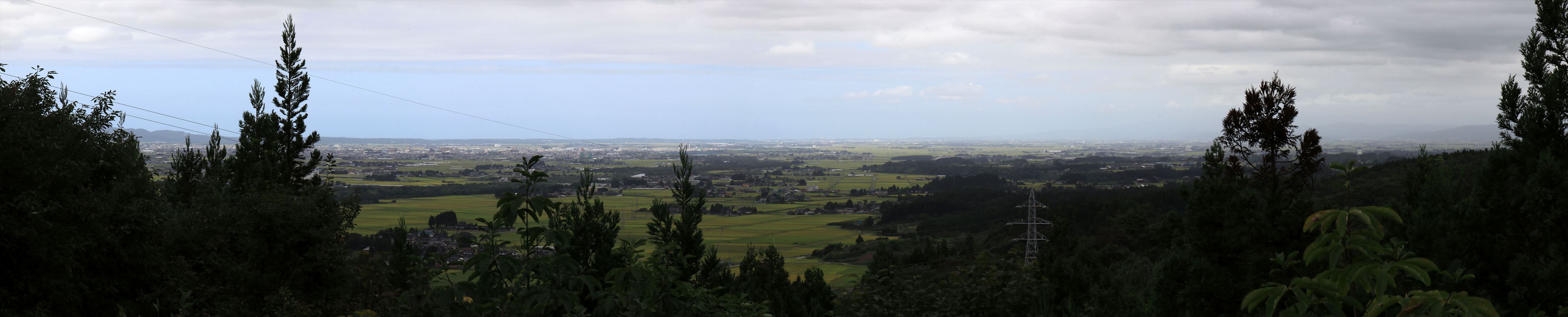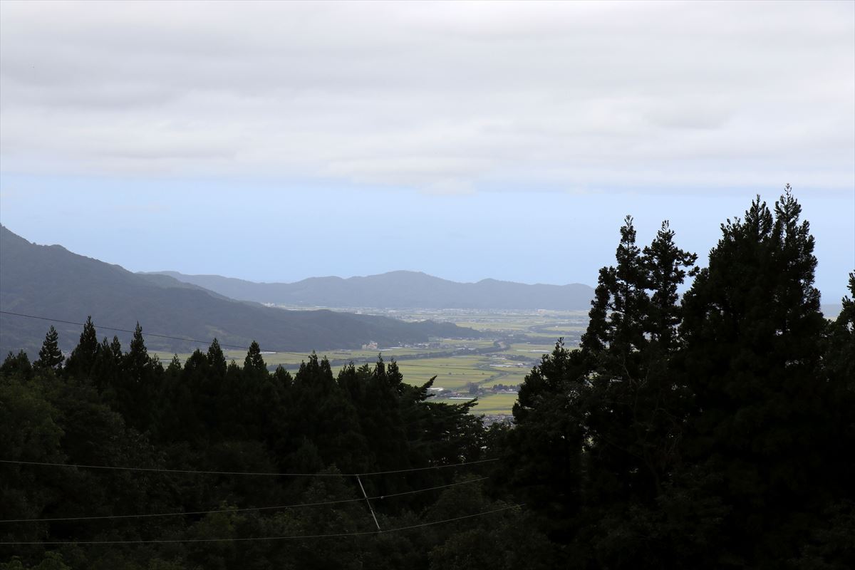 庄内平野の望遠。頭上には重々しい雲が漂っているものの、遠くには青空が広がっていました。