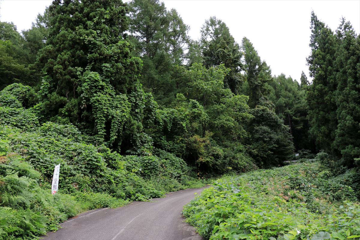 程なくして舗装路と合流しました。写真はその分岐点なんですが、藪が濃すぎてどこが分岐なのか一見しただけではよく分からない。
