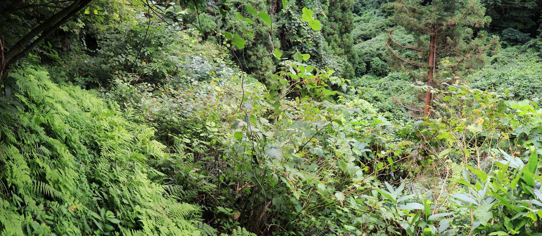 殆ど廃道同然のトラバース路の様子……左側の藪が道で、中央から右側にかけては崖となっています。歩きにくさは殆ど見た目通り。