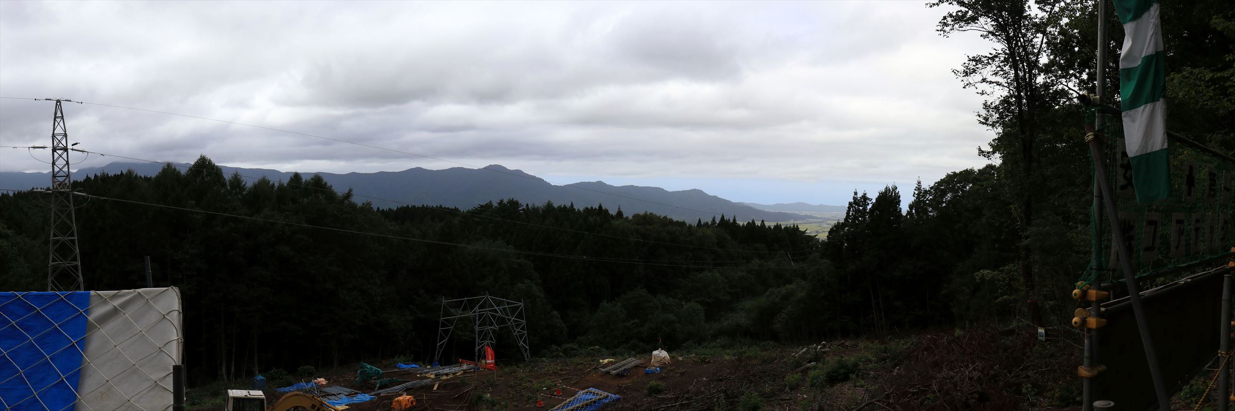 工事現場の様子。今まさに鉄塔でも建てているかのような雰囲気です。奥には最終目的地である庄内平野が見えていますが、まだ少し距離がある。
