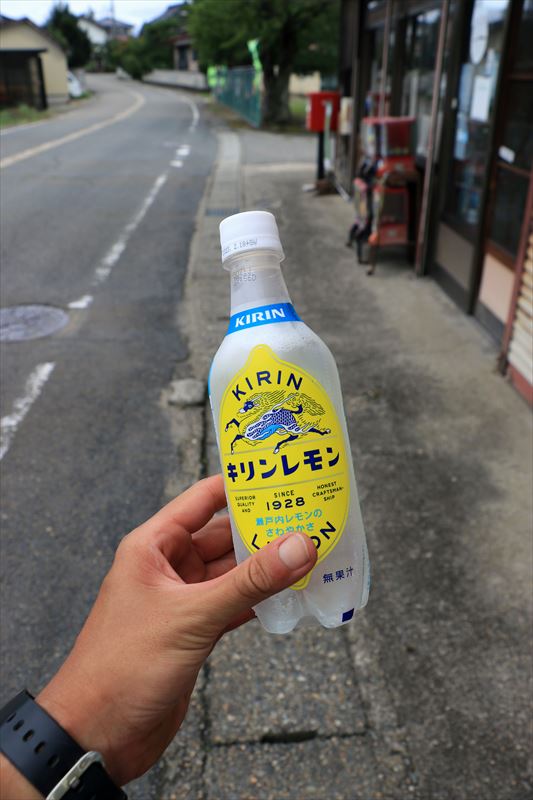 バス停のある山添地区まで7kmの舗装路歩き。まだまだ長い道程なので途中の自販機で燃料補給。疲れている時は酸味の強いものを選んでしまいがち。