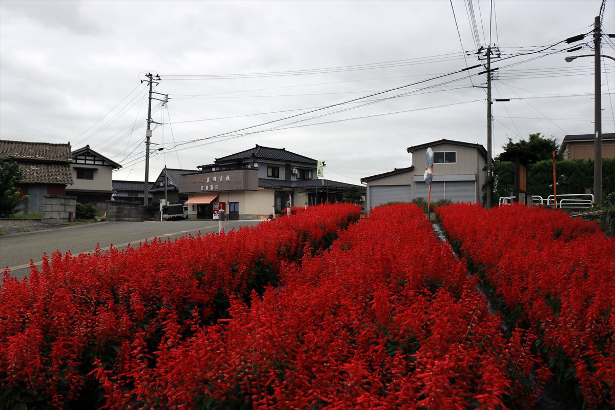 曇天でグレーな基調の中、付近の花壇に植えられたサルビアの燃えるような赤色が一際の存在感を放っていました。
