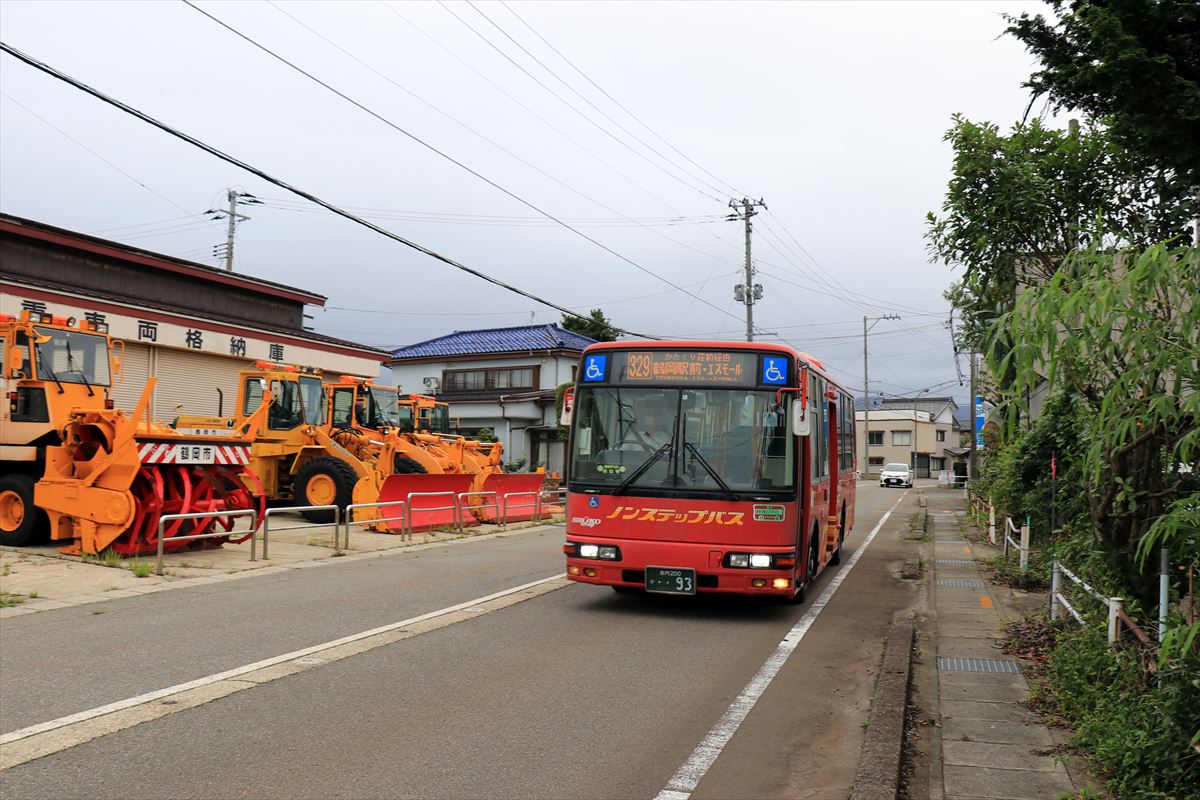 田麦俣の集落内にはバス停も置かれています。鶴岡市営バスの路線が旧朝日村の中心地に位置する朝日庁舎前まで運行されており、そこから庄内交通の路線を乗り継いで鶴岡駅まで行けるようです……今回は六十六里越街道を基点まで歩き通す予定なのでスルー。