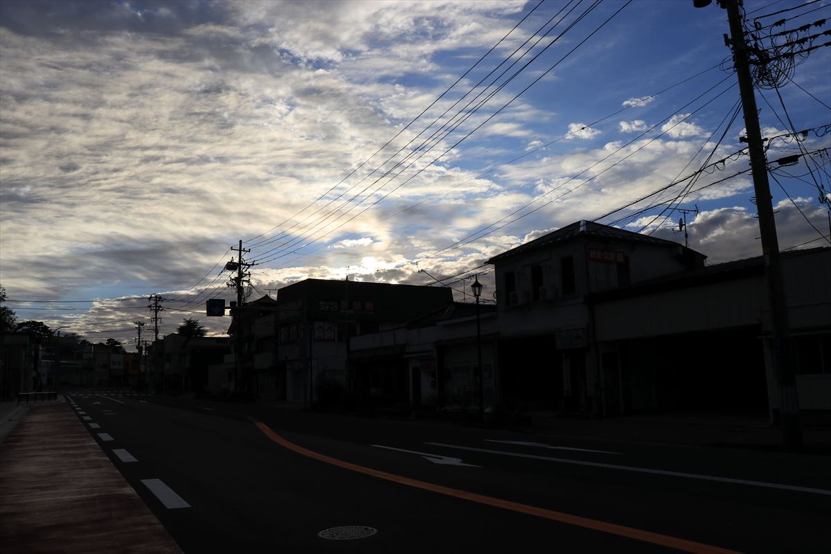駅前の街並みと空の様子。終始重々しい雲に覆われていた一日でしたが、西側は雲がほぐれ青空が広がっていました。明日の天気は期待できそうです。