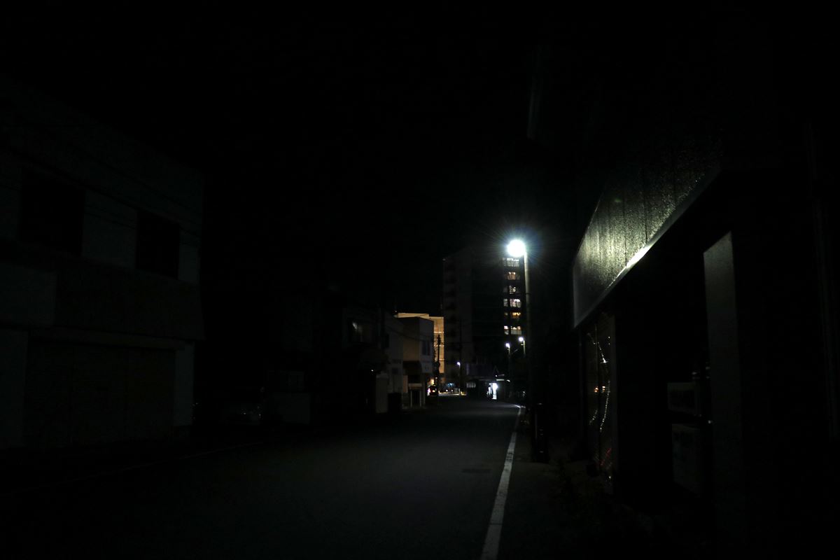 夜の帳が降りた酒田の町。メインストリート以外は街灯も少なく、暗闇に覆われている。