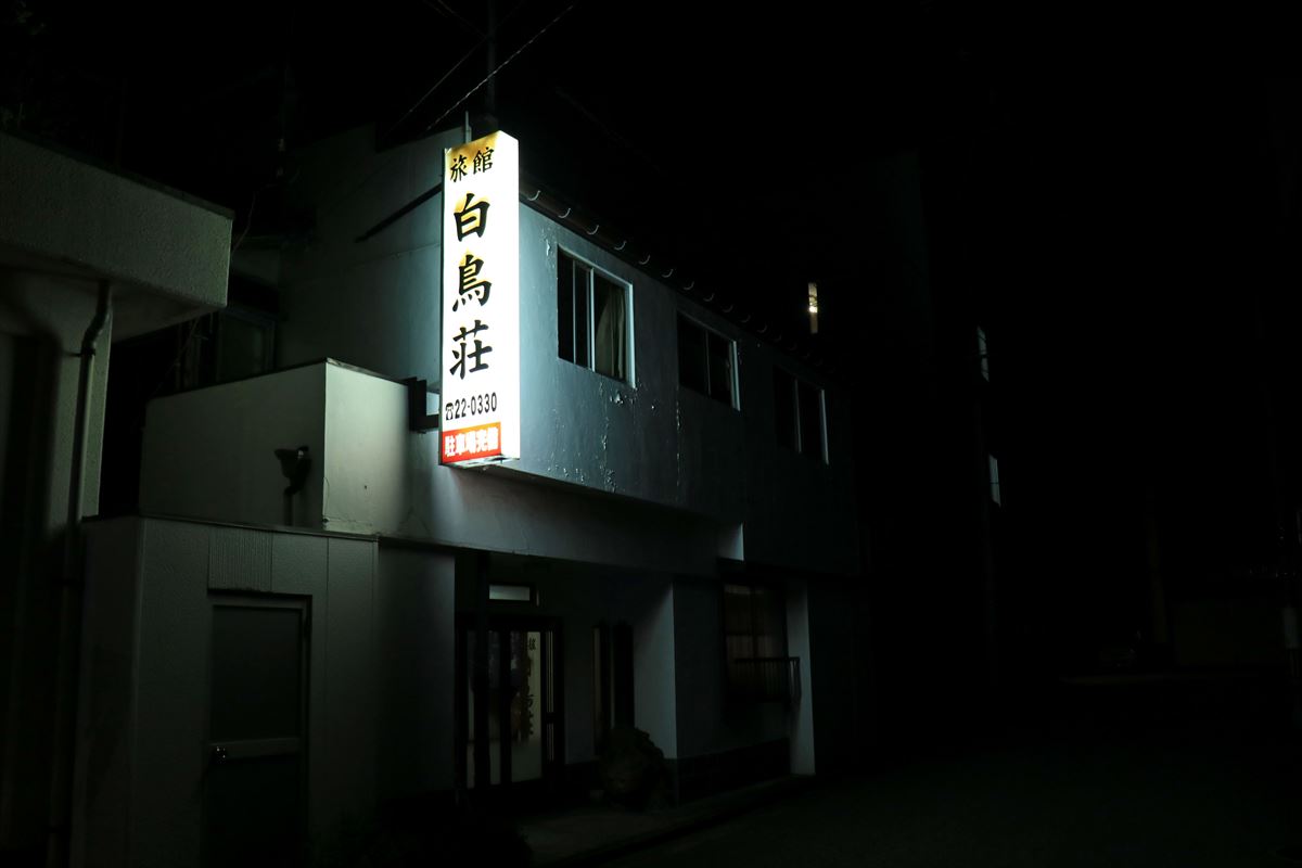 白鳥荘に戻ってきました。真っ暗闇の中、行灯のみが白く映し出されている様子は幽玄とも言える。